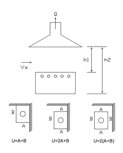 Mutfak havalandırmasında en uygun çözümlerden biri davlumbaz kullanmaktır. Mutfak davlumbazları ile kokuyu, ısıyı ve nemi kaynağı üzerinde yakalamak imkanı vardır. Davlumbazlarla gerçekleştirilen lokal havalandırma sayesinde, hava miktarlarını azaltmak mümkün olabilmektedir. Şekil 14.48'de mutfak davlumbazı hesabı verilmiştir. Davlumbazın iyi çalışması için davlumbaz ağzında belirli hava akış hızları sağlanmalıdır. Davlumbaz ne kadar iyi yerleştirilmişse, daha az hava debisiyle çalışabilir. Bunun için mümkün olduğu kadar ocağı ve davlumbazı köşeye yerleştirmelidir. Şekilde görüldüğü üzere oda ortasındaki davlumbazda, köşeye yerleştirilen davlumbaza göre iki misli daha fazla hava çekmek gerekmektedir. Çünkü hesaba giren çevre, oda ortasında iki misli daha fazladır.